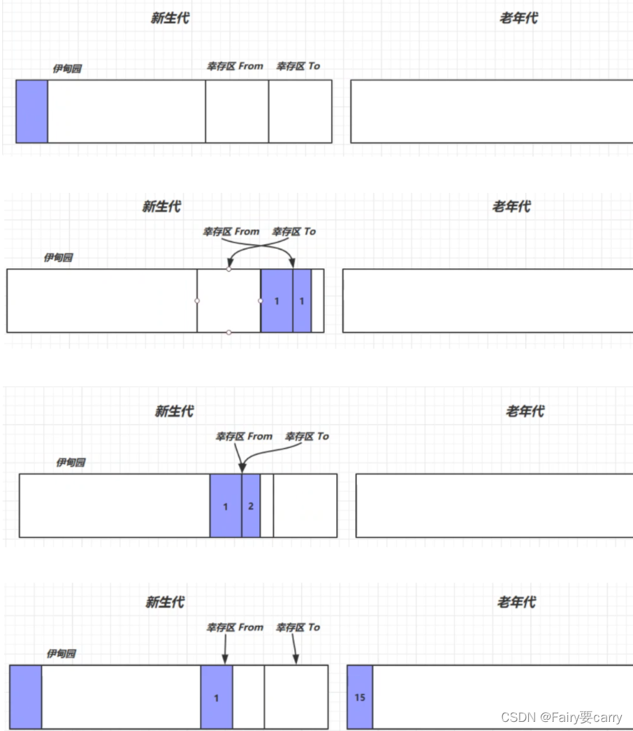 - 新生代空间不足时,触发 minor gc,伊甸园和 from 存活的对象使用 copy 复制到 to 中,存活的对象年龄加 1并且交换 from to