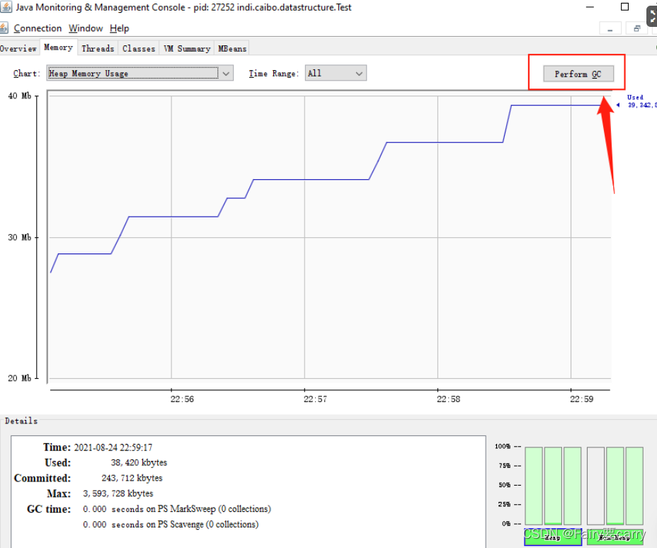3.jconsole:图形界面,可连续检测:jconsole[pid],可以在图形界面执行GC