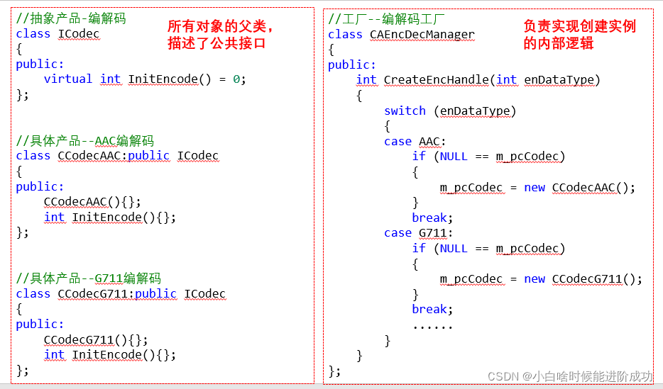 案例背景:音频编码格式分AAC、AACLD、ADPCM、G711等等,而播放某次音频只需要创建某个编码类型的类(初始化某个类的资源等)即可。