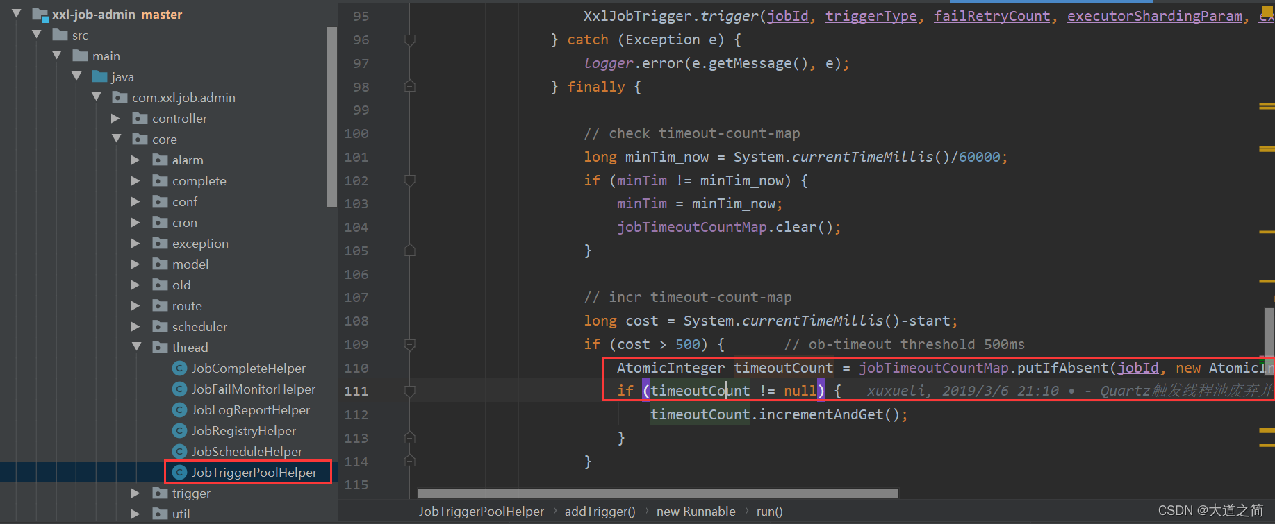 ①、定义两个线程池,一个是fastTriggerPool,另一个是slowTriggerPool。 ②、定义一个容器ConcurrentMap,存放每个任务的执行慢次数,60秒后自动清空该容器。 ③、在线程的run()方法中计算每个任务的耗时,如果大于500ms,则任务的慢执行次数+1。