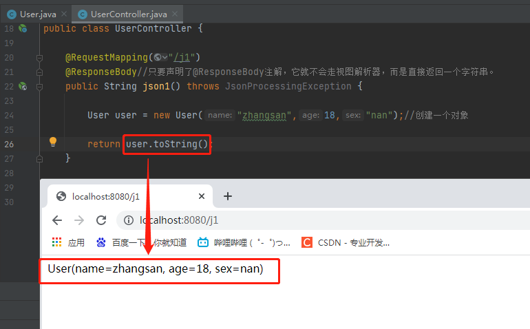 - @ResponseBody注解:放到方法上(被该注解定义的方法,不经过视图解析器直接返回值。)
