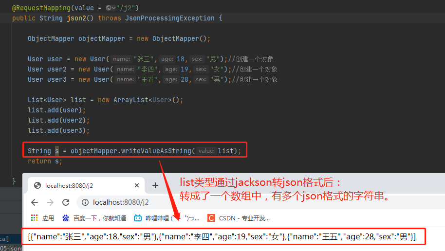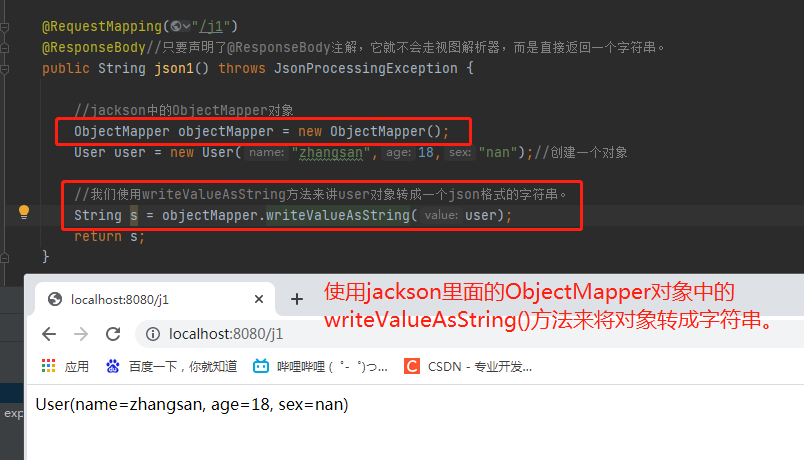 我们使用jackson中的objectMapper对象的writeValueAsString(obj)方法来将obj转成json格式的字符串。