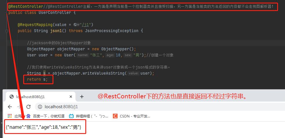 @RestController注解,一方面是声明当前是一个控制器类并且接受扫描,另一方面是当前类的方法返回的内容都不会走视图解析器!