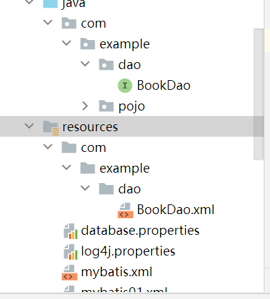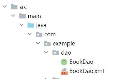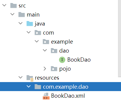2.如果想让映射文件还是在resource文件夹下,但是编译后与接口在同一文件夹下,就设置maven的pom文件 示例:  注意:这里resource下的com.example.dao文件夹名可随意取,重点是如何在pom文件中编写