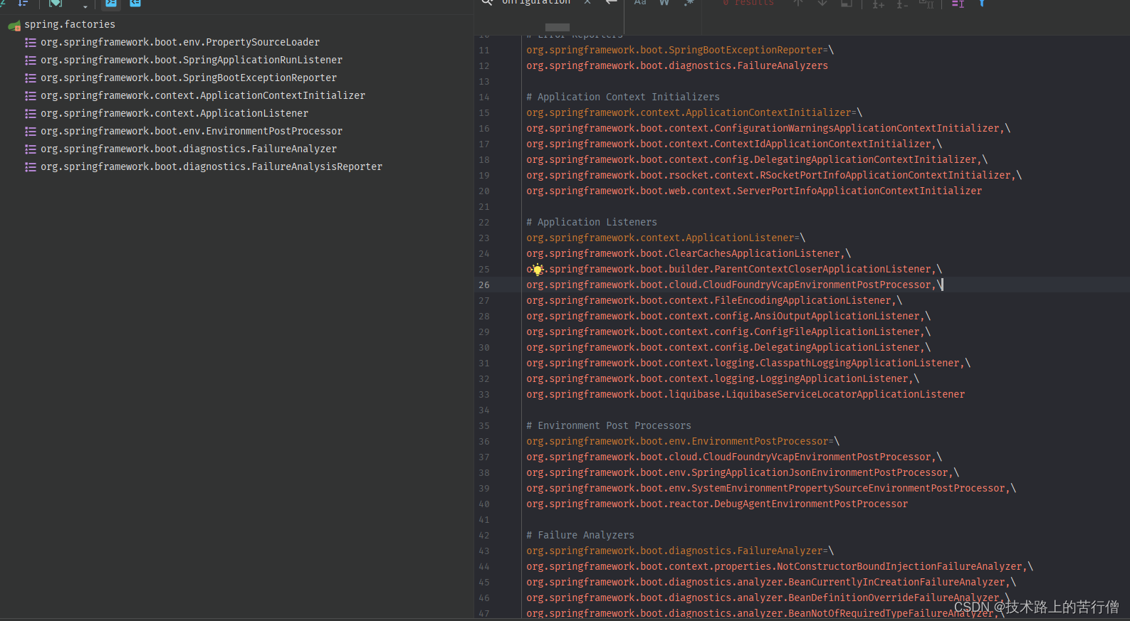 List<String> configurations = SpringFactoriesLoader.loadFactoryNames(getSpringFactoriesLoaderFactoryClass(),