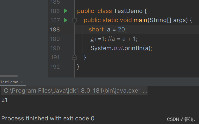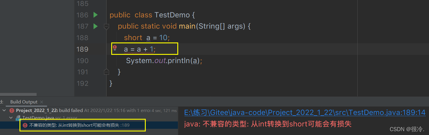 💥 下面这段代码是将int类型的数据与short类型的数据相加,将结果赋给short类型,所以会报错。