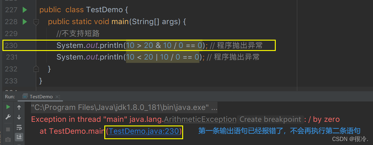 System.out.println(10 > 20 && 10 / 0 == 0); // 打印 false