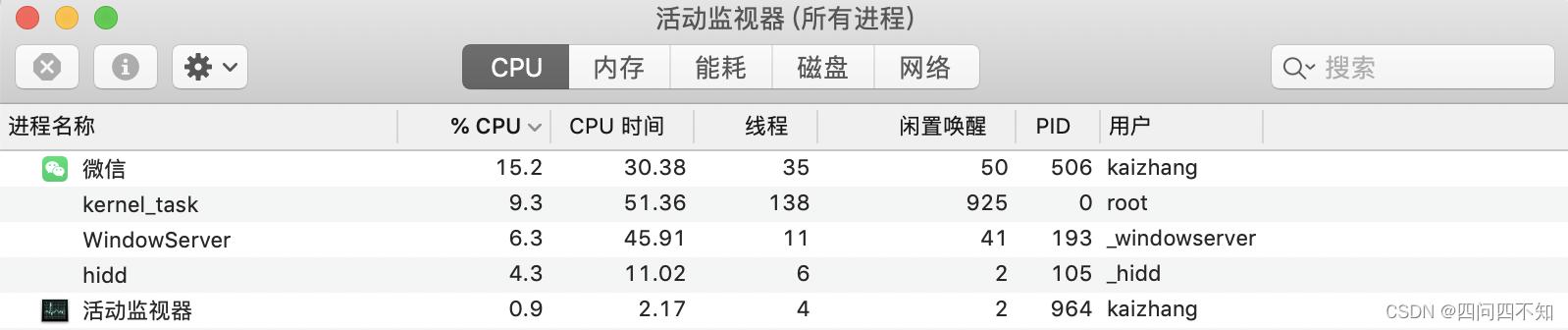 先来看一下进程,mac打开活动监视器(windows直接打开任务管理器即可)可以看到,活动监视器本身也是一个进程