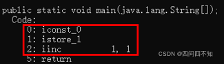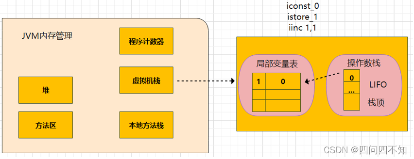 - 把局部变量1,也就是i,增加1,这个指令不会导致栈的变化,i此时变成1了