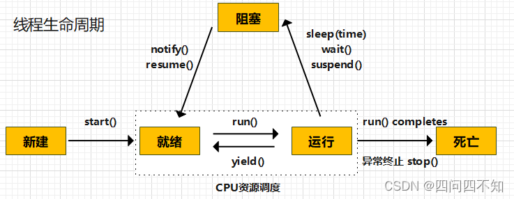 每个线程的生命周期如上所示,都会经历新建状态到就绪状态,主线程(main线程)和子线程都处于就绪态后,后面就由CPU资源调度来决定谁先run(),并不是说子线程代码在前面它就先执行。CPU时间片轮到谁,谁先执行。