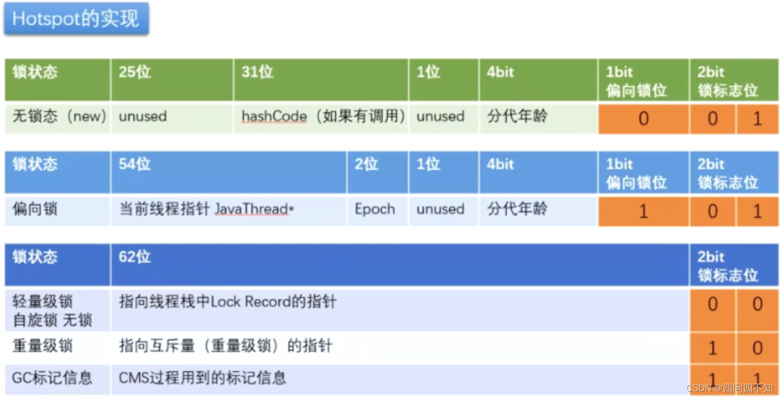 了解的人看到上面的加锁方式就知道这是一种很粗力度的加锁操作,使用了一把对象锁。Synchronized关键字本质上是修改的对象锁标志位信息。下面左图是一个Java对象的内存结构(对象头占8个字节,类型指针压缩可占4字节,一般占8字节,实例数据是多少就是多少,对齐填充补齐到能被8字节整除),锁的信息在8字节的对象头(Mark Word)中,而右图是Mark Word在Hotspot中的比特位信息。