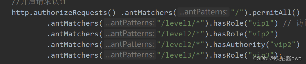 .antMatchers("/level1/*").hasRole("vip1") // 访问请求为/level1需要有vip1的权限