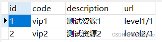 CREATE TABLE `t_permission` ( `id` varchar(32) NOT NULL, `code` varchar(32) NOT NULL COMMENT '权限标识符', `description` varchar(64) DEFAULT NULL COMMENT '描述', `url` varchar(128) DEFAULT NULL COMMENT '请求地址', PRIMARY KEY (`id`) ) ENGINE=InnoDB DEFAULT CHARSET=utf8 insert into `t_permission`(`id`,`code`,`description`,`url`) values ('1','p1','测试资源 1','/r/r1'),('2','p3','测试资源2','/r/r2');?