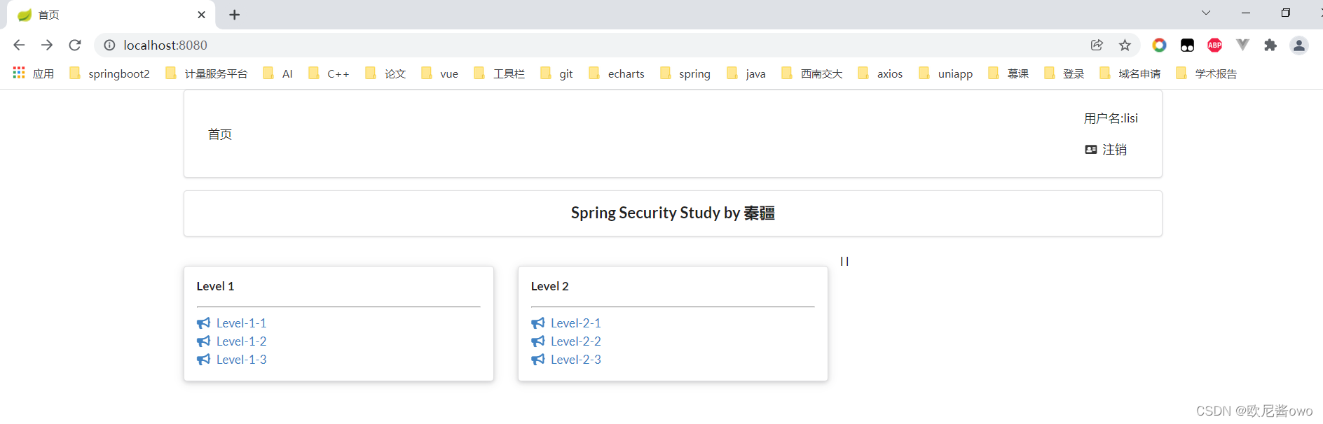 对应的逻辑也就是先登录=》通过自定义UserDetailsServiceImpl的loadUserByUsername方法获取对应的用户密码和权限=》spring security验证密码对不对,验证成功跳转到index页面=》index页面通过sec:authorize="hasAuthority('对应权限')"来判断是否显示该level=》