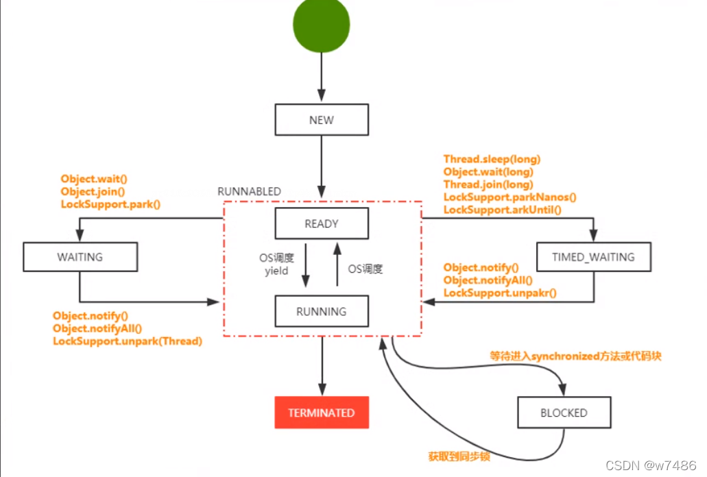 RUNNABLED:运行状态,JAVA线程把操作系统中的就绪和运行两种状态统一称为“运行中”
