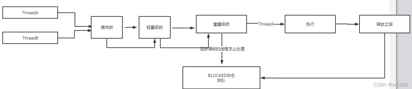 获取锁失败就会锁膨胀,变成重量级锁。
