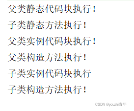 1.父类静态代码块执行 2.子类静态方法执行 3.父类实例代码块执行 4.父类构造方法执行 5.子类实例代码块执行 6.子类构造方法执行