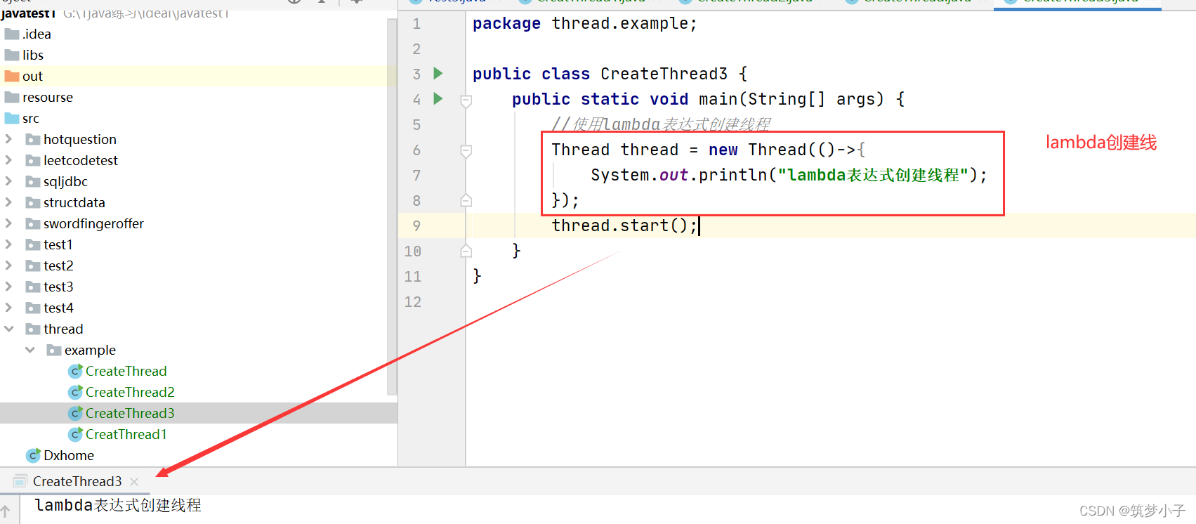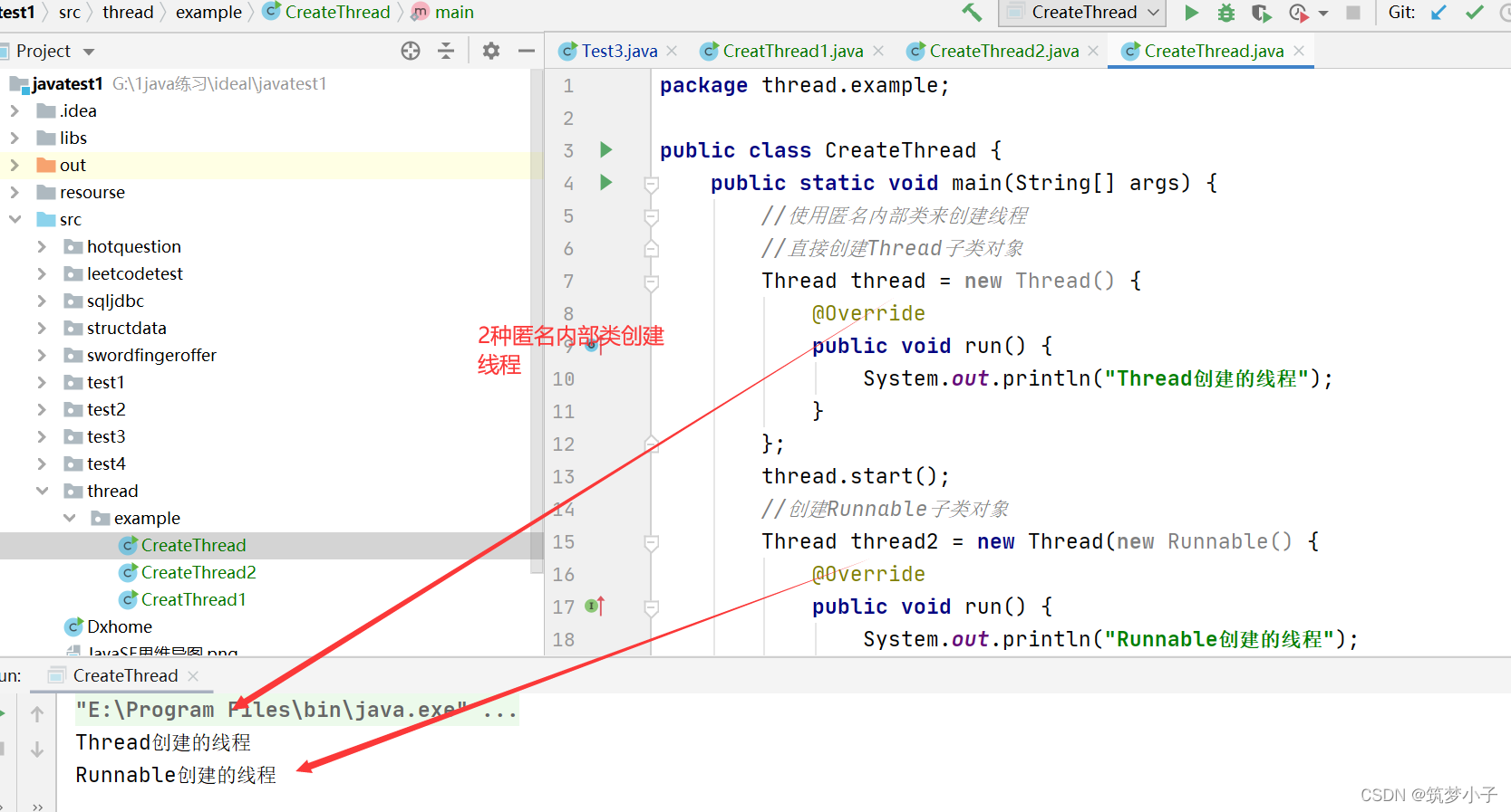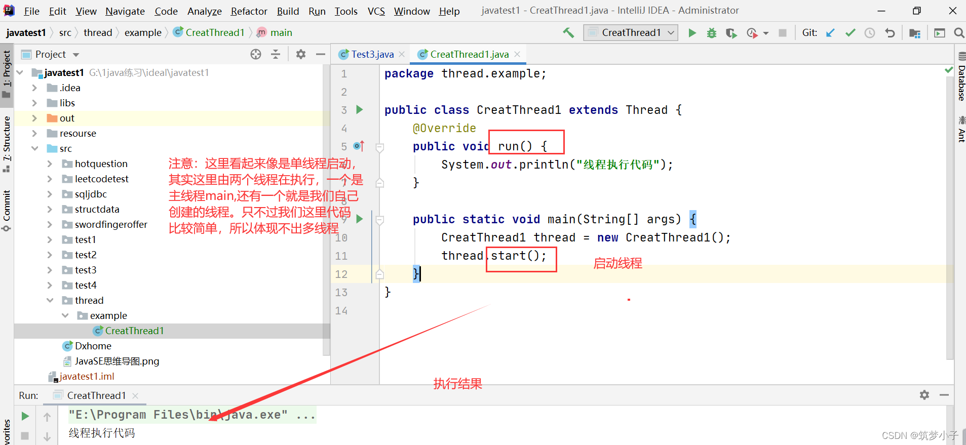 这里在创建线时需要注意:首先需要重写run方法,之后启动线程通过调用start方法来进行启动