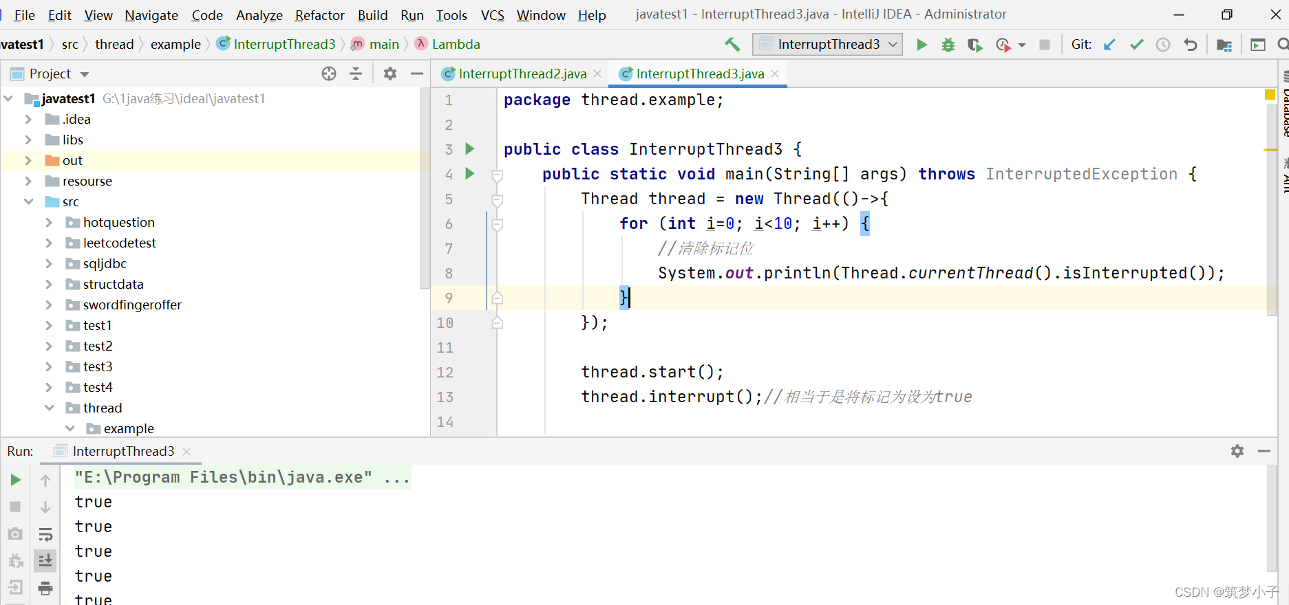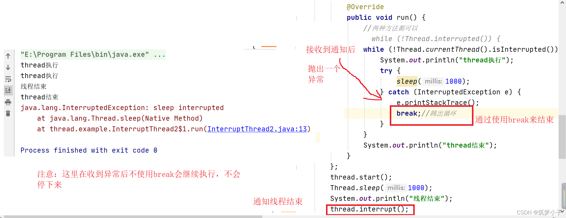 注意:如果使用使用这两种通知方式的时候,如果线程里面包含wait/join/sleep 等方法而阻塞挂起,这时候就会抛出一个异常,从而都会清除标记位,这时候有2种选择,一个是忽略该异常,继续执行;另一个是跳出该异常,结束循环。