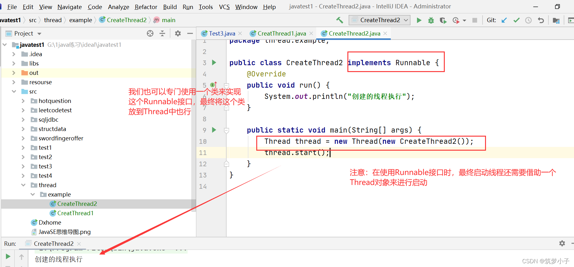 注意:在实现该接口,需要重写run方法,同时还需要借助Thread来进行启动。