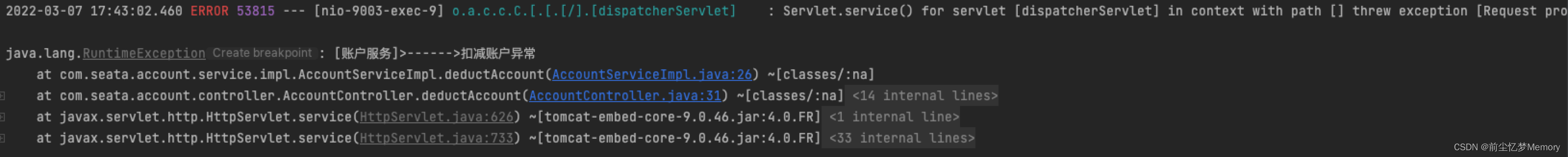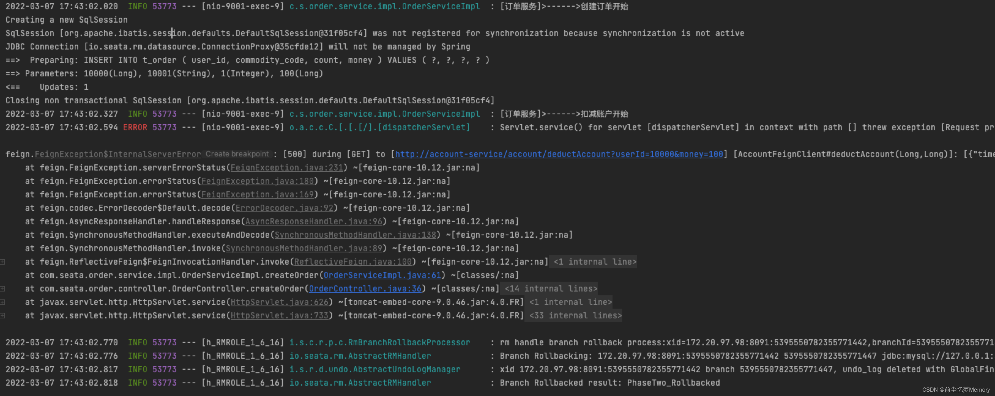 ????????创建订单的时候,在order服务调用account服务的时候发生了异常?,下面日志可以看出,数据已经开始回滚。