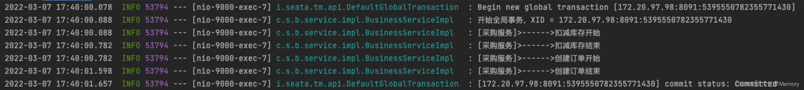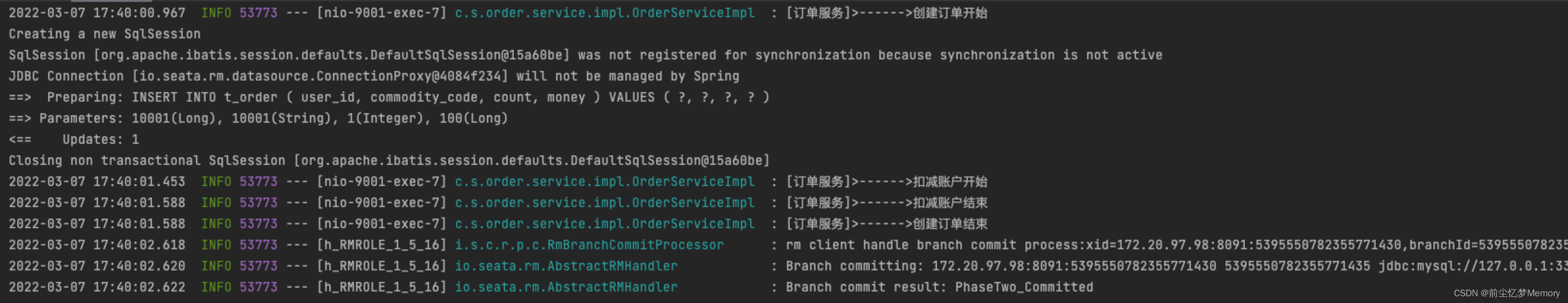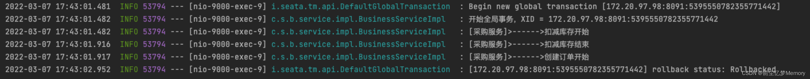 ????????发起创建订单的请求后,日志里面可以清楚的看到本次全局事务的情况,