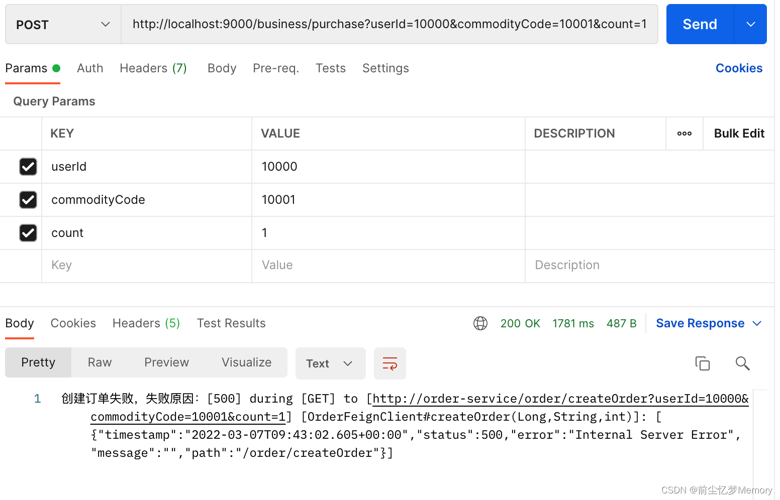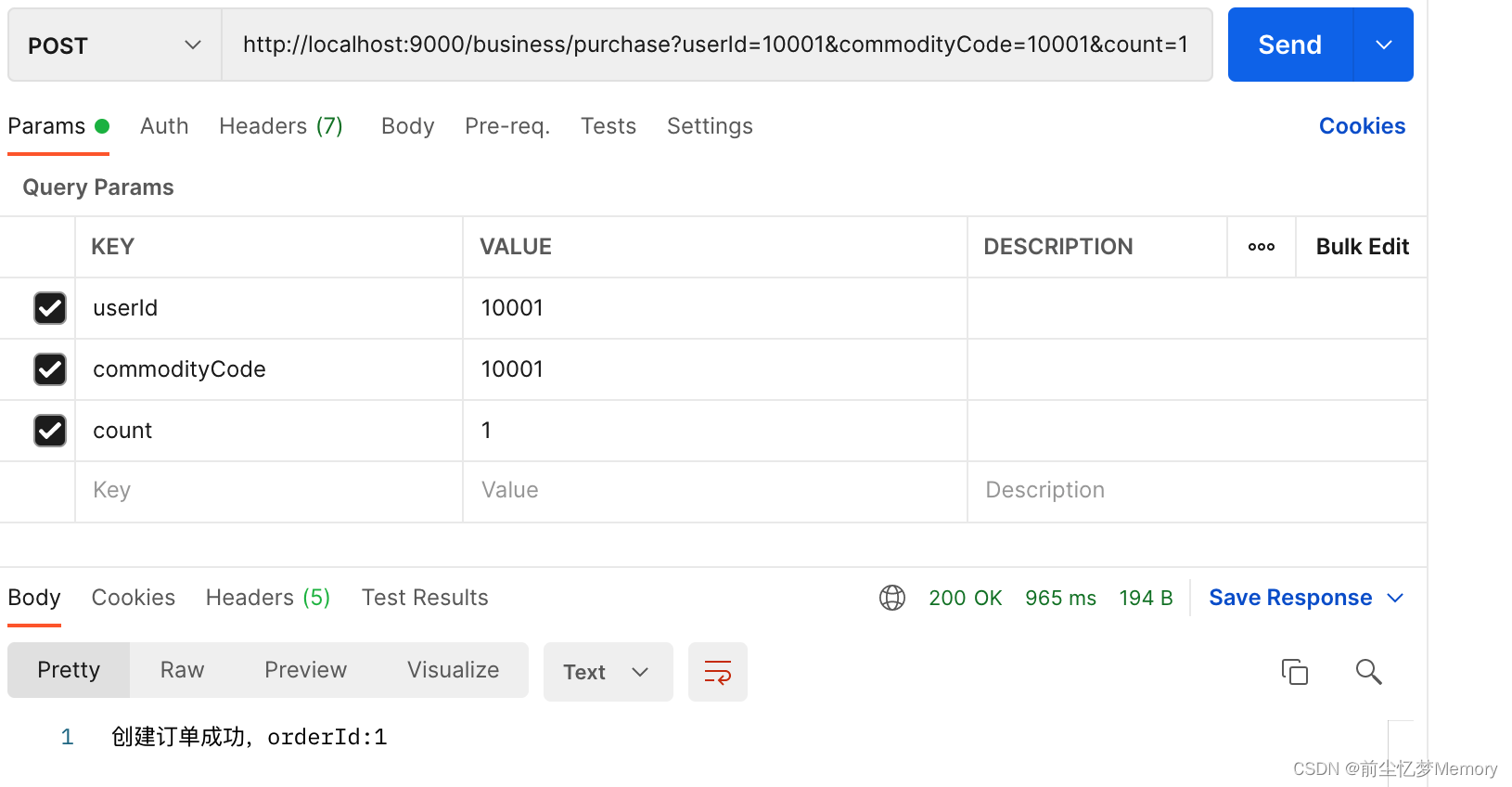 ????????请求地址:? ? ? ? http://localhost:9000/business/purchase?userId=10001&commodityCode=10001&count=1