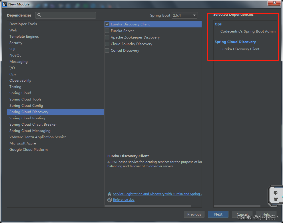 2、前面的和之前新建Eureka项目一样,不过这次选的依赖不一样了,这次选了SpringBoot admin 的server服务和Eureka的client服务,这样以后注册到Eureka的服务就会自动同步到SpringBoot admin,不用再对SpringBoot admin进行注册。