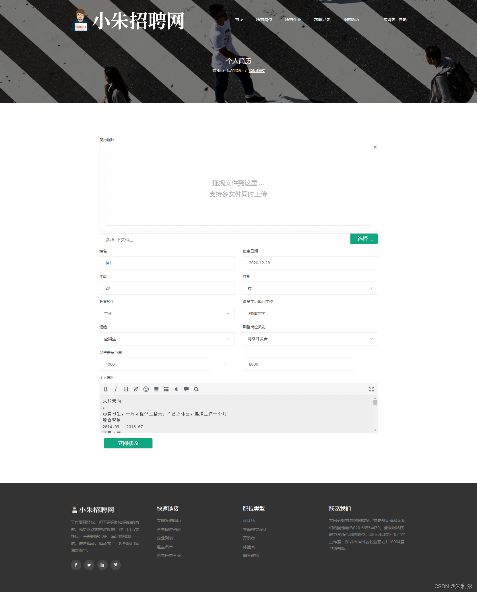 - 这是一个免费、轻量化、简单、易上手的招聘网站项目,系统包括完整的前端HTML页面和后台代码,该项目适合作为JavaWeb入门或毕业设计使用,且具备一定的实用价值,项目中涉及皮尔逊相关系数的相似度算法Java实现和实际应用可查看职位推荐模块。