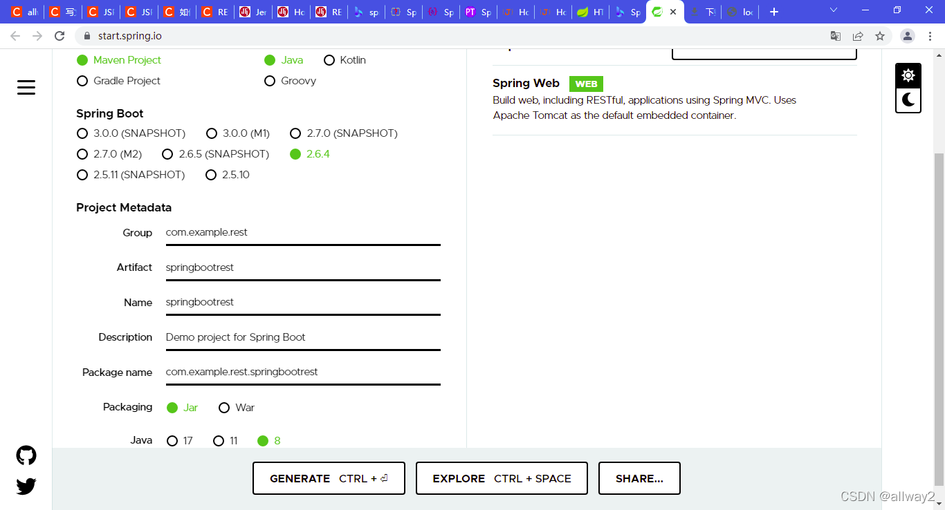 打开 Spring Initializr 并创建一个 Spring Boot Rest 项目,如下图所示。添加 REST 依赖项并生成项目。