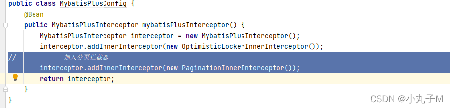 ①、在配置器MybatisPlusConfig中加入配置拦截器: