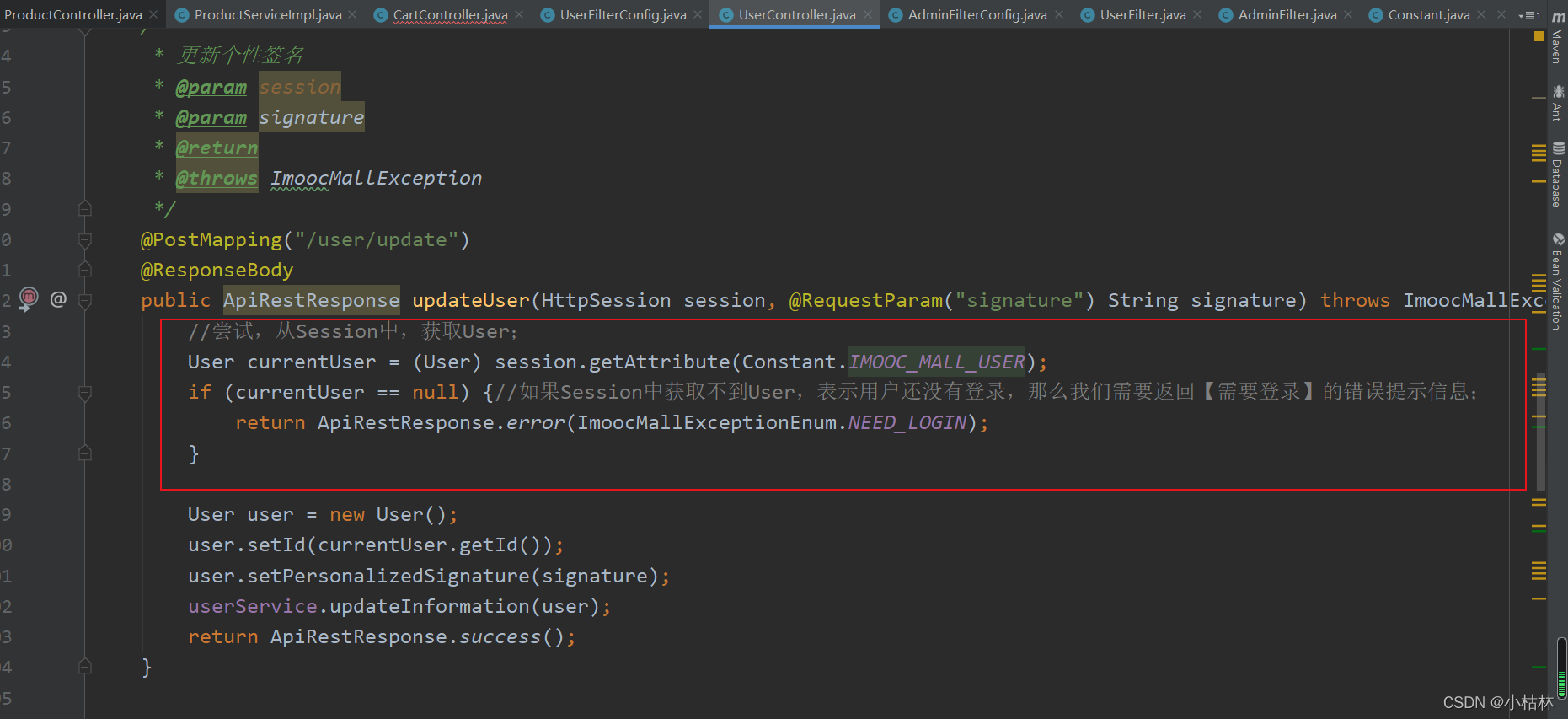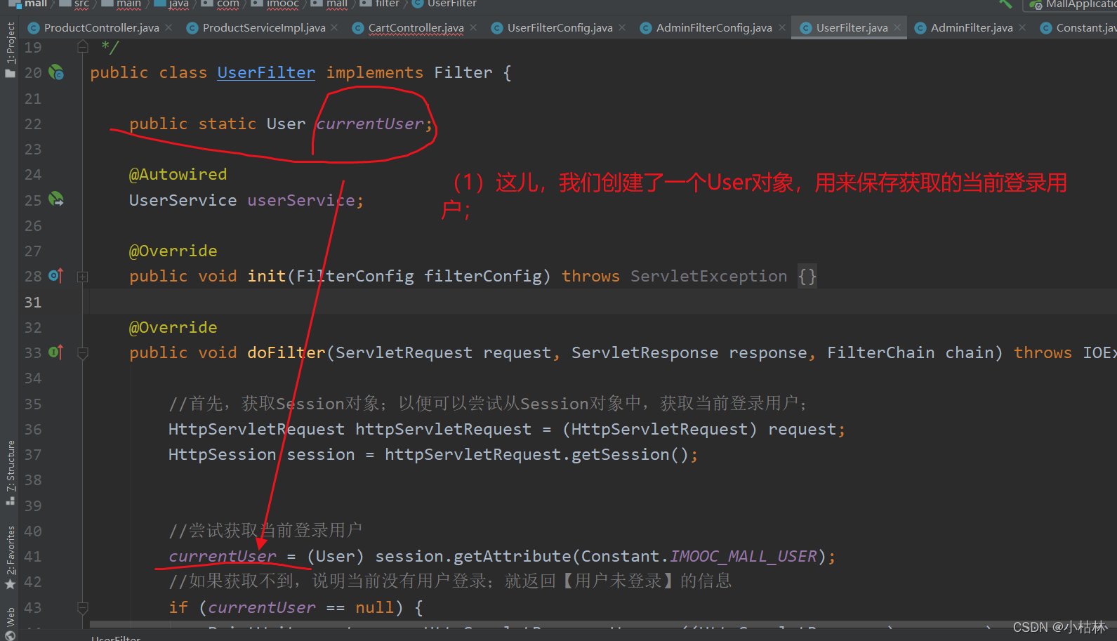 currentUser = (User) session.getAttribute(Constant.IMOOC_MALL_USER);