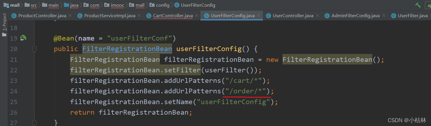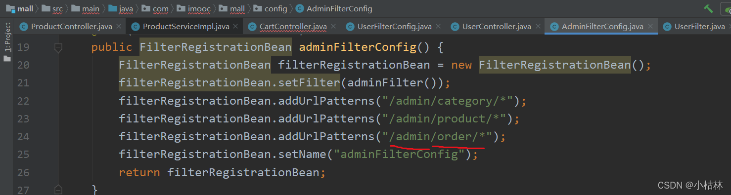 ?? ? ? ? ? ●?后台有:【订单列表】、【订单发货】这2个接口;这两个接口需要是管理员用户登录,才能够操作;我们在AdminFilterConfig中已经配置了;