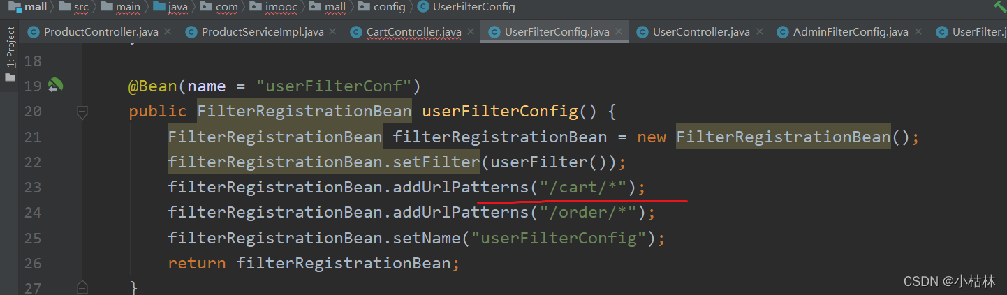 ?? ? ? ? ? ●?购物车模块的接口都是前台的,有:【购物车列表】、【添加商品到购物车】、【更新购物车某个商品的数量】、【删除购物车的某个商品】、【选中/不选中购物车的某个商品】、【全选/全不选中购物车的商品】6个接口;这6个接口是需要用户登录才能够调用的;(没有区分是普通用户还是管理员用户)对此,我们在UserFilterConfig中进行了处理;