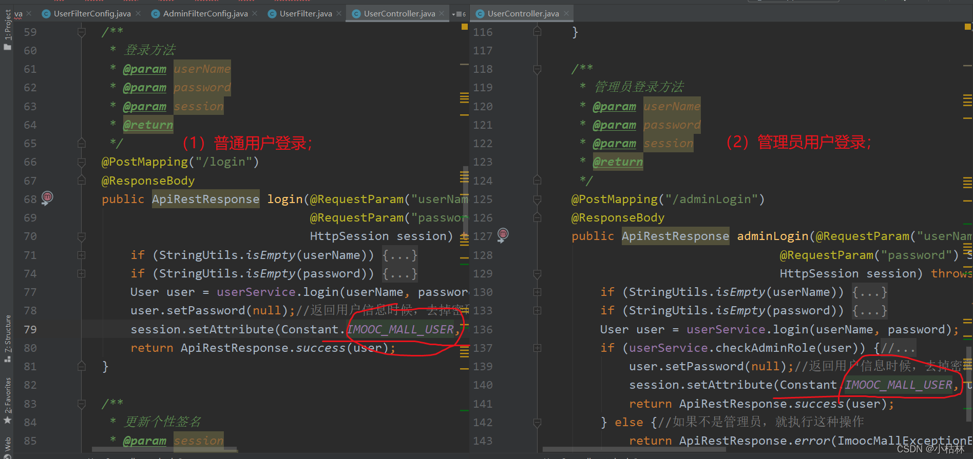 ? ? ? ? ? ●?其实,我们在UserController中,我们普通用户登录和管理员用户登录时,保存在Session中的User对象其名字我们也起做一样了;