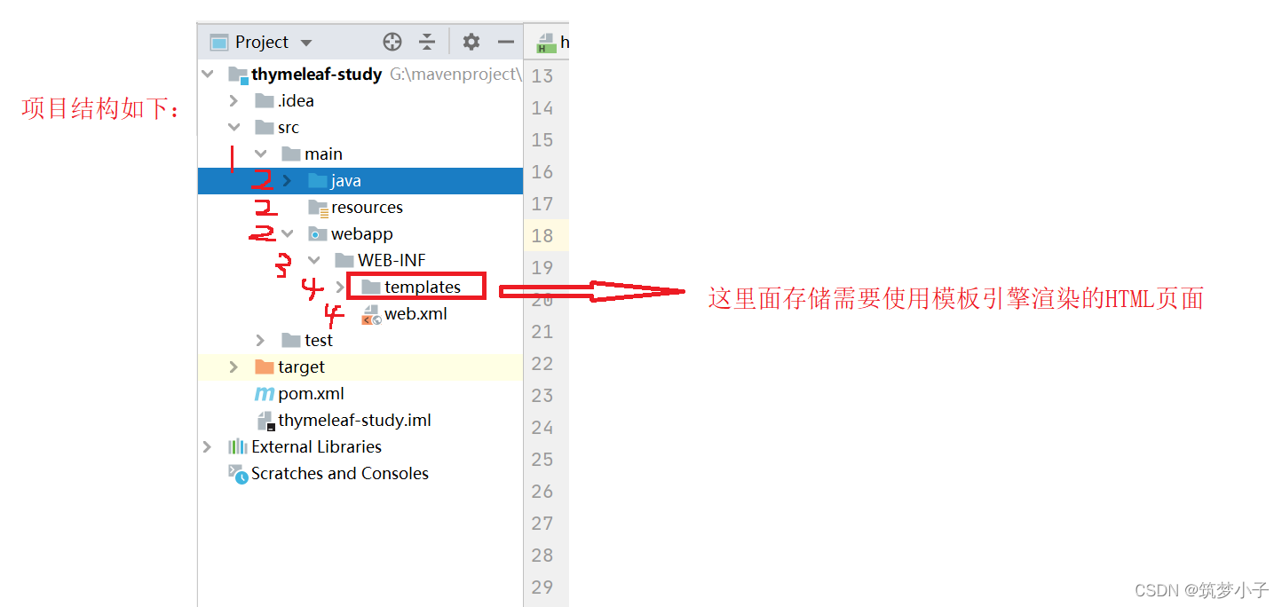 在使用模板技术时,将需要使用模板技术进行渲染的页面需要放到指定文件夹中才能起到效果,这里就了解一下整体的Maven项目结构。