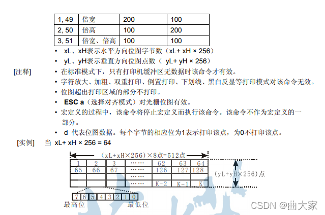 xL xH 表示宽度,是字节数,等于图像的宽度/8,如果除不尽,增加一个,于是x=(width+7)/8。
