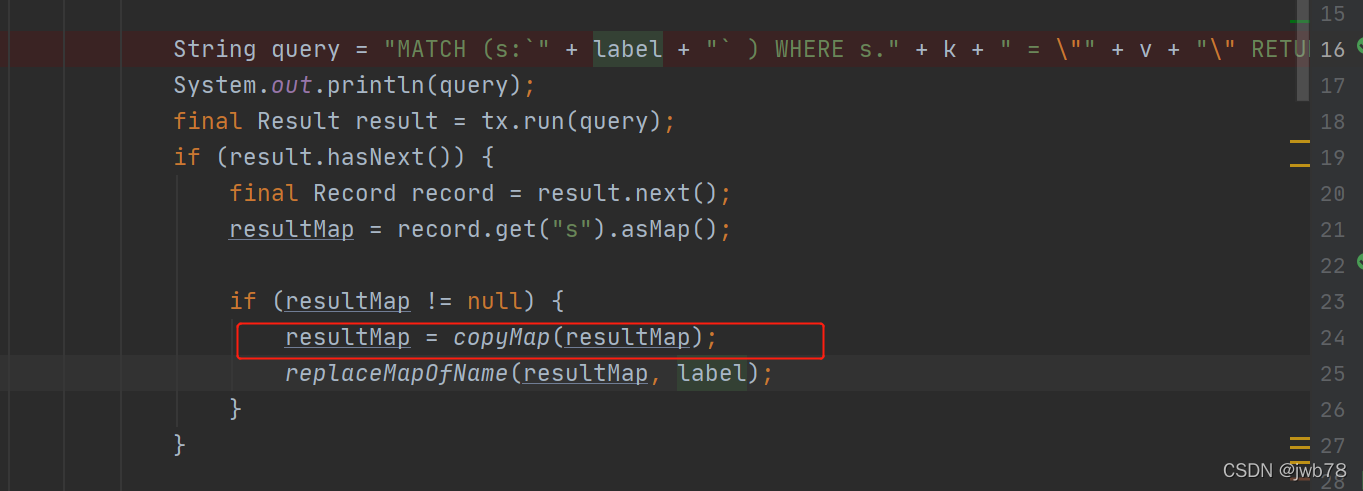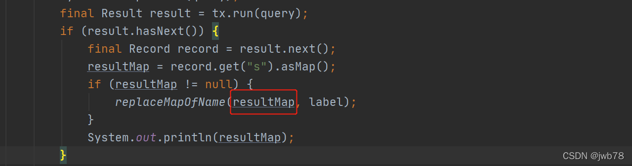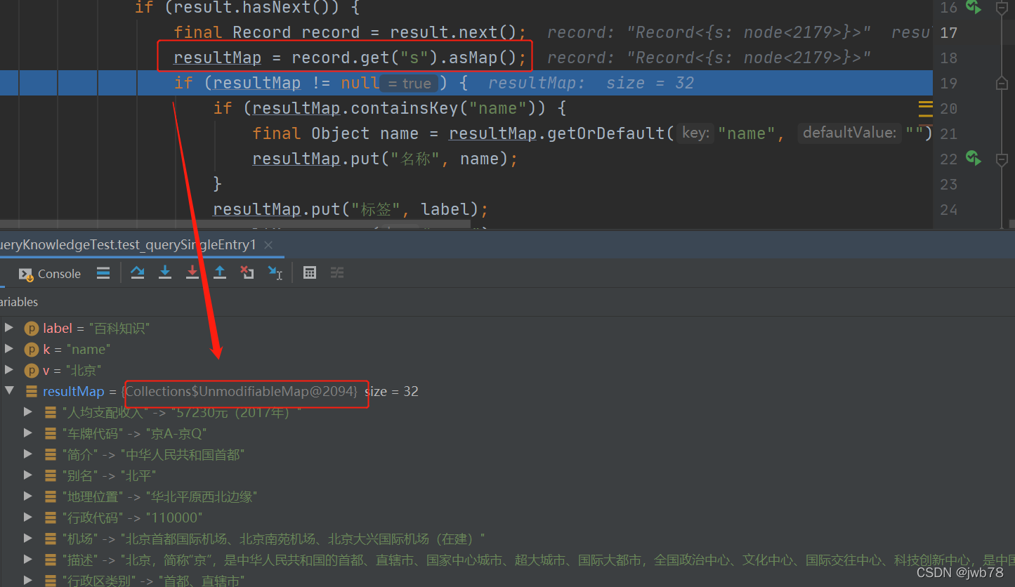 java.lang.UnsupportedOperationException ?? ?at java.util.Collections$UnmodifiableMap.put(Collections.java:1457) ?? ?at com.jwb.neo4j.QueryKnowledge.replaceMapOfName(QueryKnowledge.java:94) ?? ?at com.jwb.neo4j.QueryKnowledge.querySingleEntry(QueryKnowledge.java:31) ?? ?at com.jwb.neo4j.QueryKnowledgeTest.test_querySingleEntry1(QueryKnowledgeTest.java:17) ?? ?at sun.reflect.NativeMethodAccessorImpl.invoke0(Native Method) ?? ?at sun.reflect.NativeMethodAccessorImpl.invoke(NativeMethodAccessorImpl.java:62) ?? ?at sun.reflect.DelegatingMethodAccessorImpl.invoke(DelegatingMethodAccessorImpl.java:43) ?? ?at java.lang.reflect.Method.invoke(Method.java:498) ?? ?at org.junit.runners.model.FrameworkMethod$1.runReflectiveCall(FrameworkMethod.java:59) ?? ?at org.junit.internal.runners.model.ReflectiveCallable.run(ReflectiveCallable.java:12) ?? ?at org.junit.runners.model.FrameworkMethod.invokeExplosively(FrameworkMethod.java:56) ?? ?at org.junit.internal.runners.statements.InvokeMethod.evaluate(InvokeMethod.java:17) ?? ?at org.junit.runners.ParentRunner$3.evaluate(ParentRunner.java:306) ?? ?at org.junit.runners.BlockJUnit4ClassRunner$1.evaluate(BlockJUnit4ClassRunner.java:100) ?? ?at org.junit.runners.ParentRunner.runLeaf(ParentRunner.java:366) ?? ?at org.junit.runners.BlockJUnit4ClassRunner.runChild(BlockJUnit4ClassRunner.java:103) ?? ?at org.junit.runners.BlockJUnit4ClassRunner.runChild(BlockJUnit4ClassRunner.java:63) ?? ?at org.junit.runners.ParentRunner$4.run(ParentRunner.java:331) ?? ?at org.junit.runners.ParentRunner$1.schedule(ParentRunner.java:79) ?? ?at org.junit.runners.ParentRunner.runChildren(ParentRunner.java:329) ?? ?at org.junit.runners.ParentRunner.access$100(ParentRunner.java:66) ?? ?at org.junit.runners.ParentRunner$2.evaluate(ParentRunner.java:293) ?? ?at org.junit.runners.ParentRunner$3.evaluate(ParentRunner.java:306) ?? ?at org.junit.runners.ParentRunner.run(ParentRunner.java:413) ?? ?at org.junit.runner.JUnitCore.run(JUnitCore.java:137) ?? ?at com.intellij.junit4.JUnit4IdeaTestRunner.startRunnerWithArgs(JUnit4IdeaTestRunner.java:68) ?? ?at com.intellij.rt.junit.IdeaTestRunner$Repeater.startRunnerWithArgs(IdeaTestRunner.java:33) ?? ?at com.intellij.rt.junit.JUnitStarter.prepareStreamsAndStart(JUnitStarter.java:230) ?? ?at com.intellij.rt.junit.JUnitStarter.main(JUnitStarter.java:58)