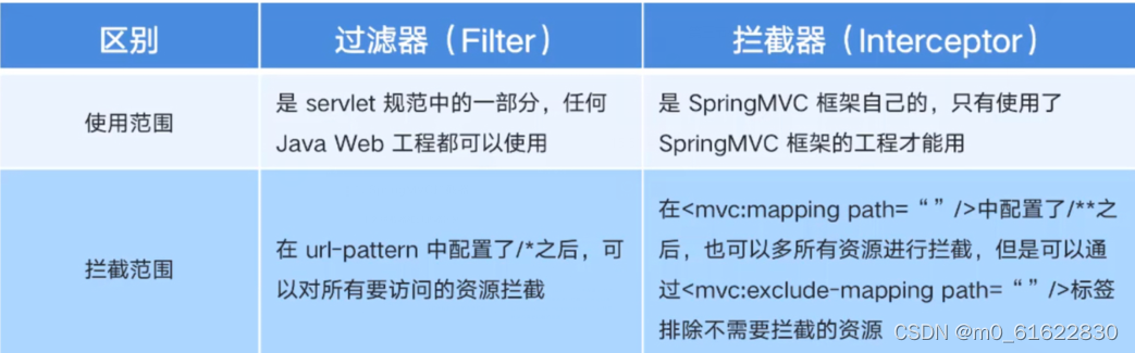SpringMVC的拦截器类似于Servlet开发中的过滤器Filter,用于对处理器进行预处理和后处理。