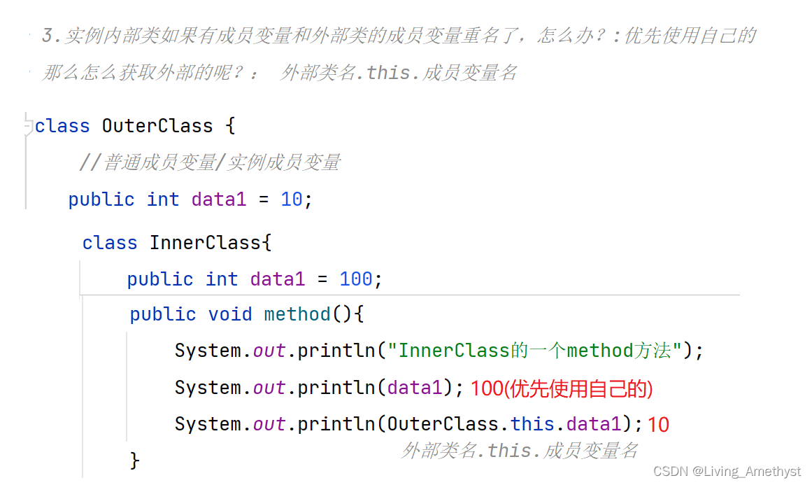 // 如果外部类和内部类中具有相同名称成员时,优先访问的是内部类自己的