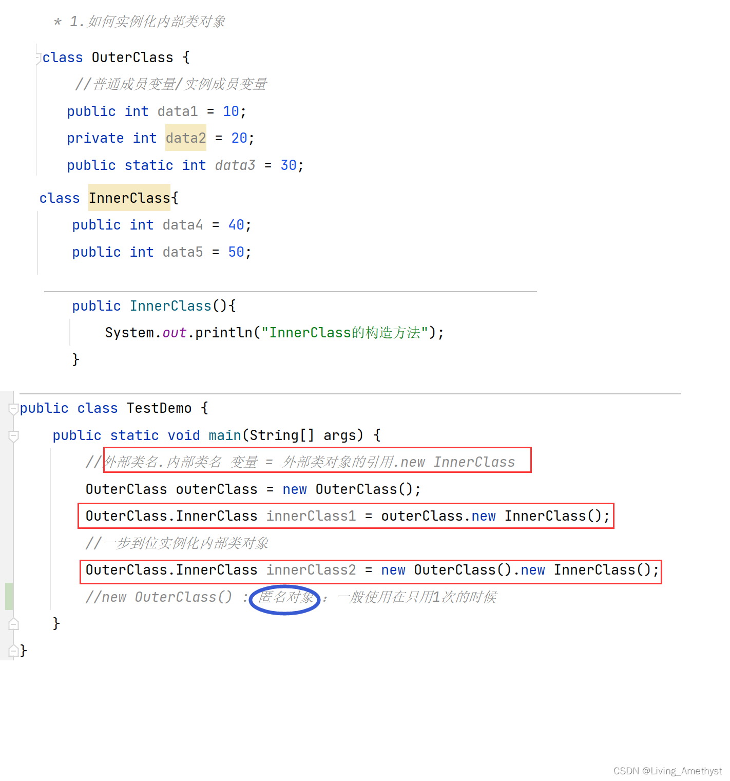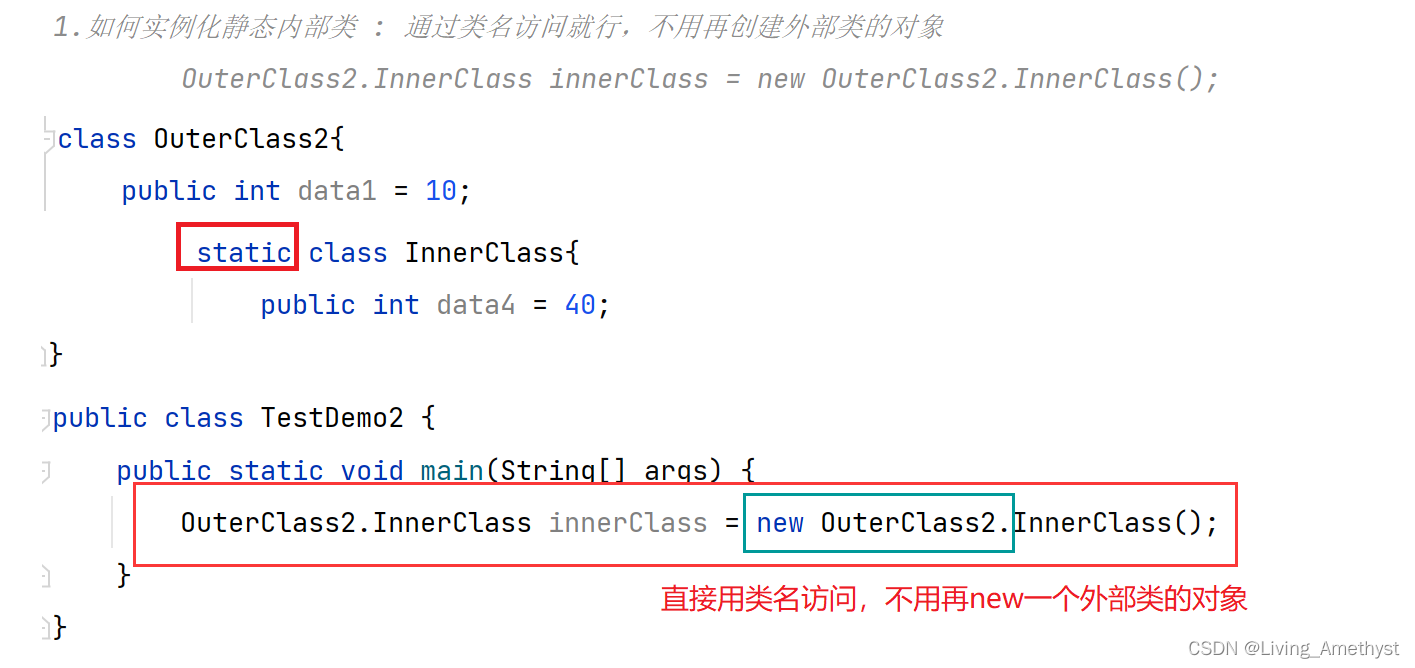 // 上述语法比较怪异,也可以先将外部类对象先创建出来,然后再创建内部类对象