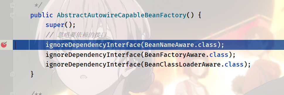 这几个ignore 是为了 在进行创建的的时候进行忽略 不进行加载 由 spring的创建bean的流程我们可以知道,aware接口是在 bean进行初始化后 进行拓展的时候才需要使用aware接口来进行拓展,所以在开始的创建 beanfactory的时候 不需要进行管理: