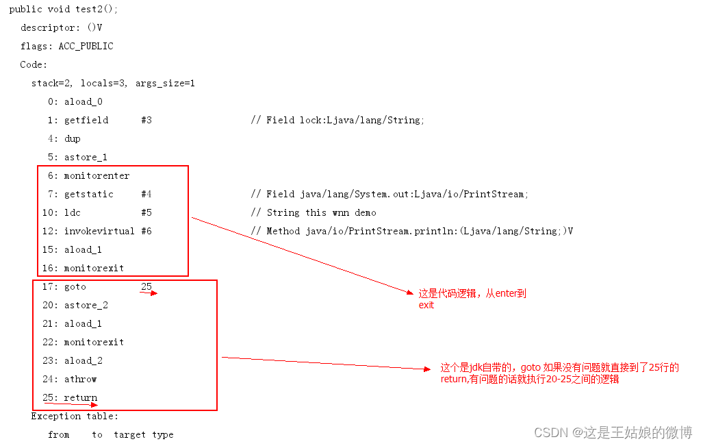 加了 synchronized 关键字的代码段,生成的字节码文件会多出 monitorenter 和 monitorexit 两条指令,每个monitor维护着一个记录着拥有次数的计数器, 未被拥有的monitor的该计数器为0,当一个线程获执行monitorenter后,该计数器自增1;当同一个线程执行monitorexit指令的时候,计数器再自减1。当计数器为0的时候,monitor将被释放.也叫显式同步