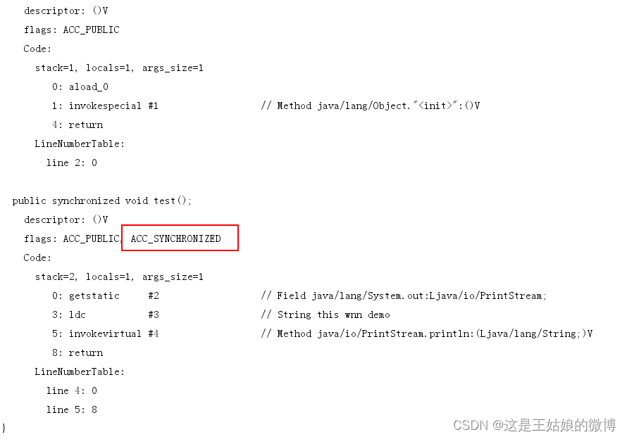 ?生成的字节码文件中会多一个 ACC_SYNCHRONIZED 标志位,当一个线程访问方法时,会去检查是否存在ACC_SYNCHRONIZED标识,如果存在,执行线程将先获取monitor,获取成功之后才能执行方法体,方法执行完后再释放monitor。在方法执行期间,其他任何线程都无法再获得同一个monitor对象,也叫隐式同步