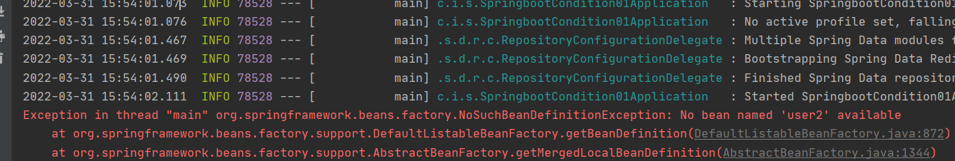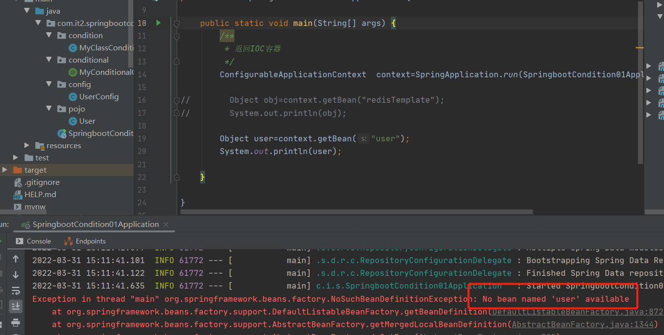 - 注释掉jedis的依赖,再运行。容器内找不到user这个bean。