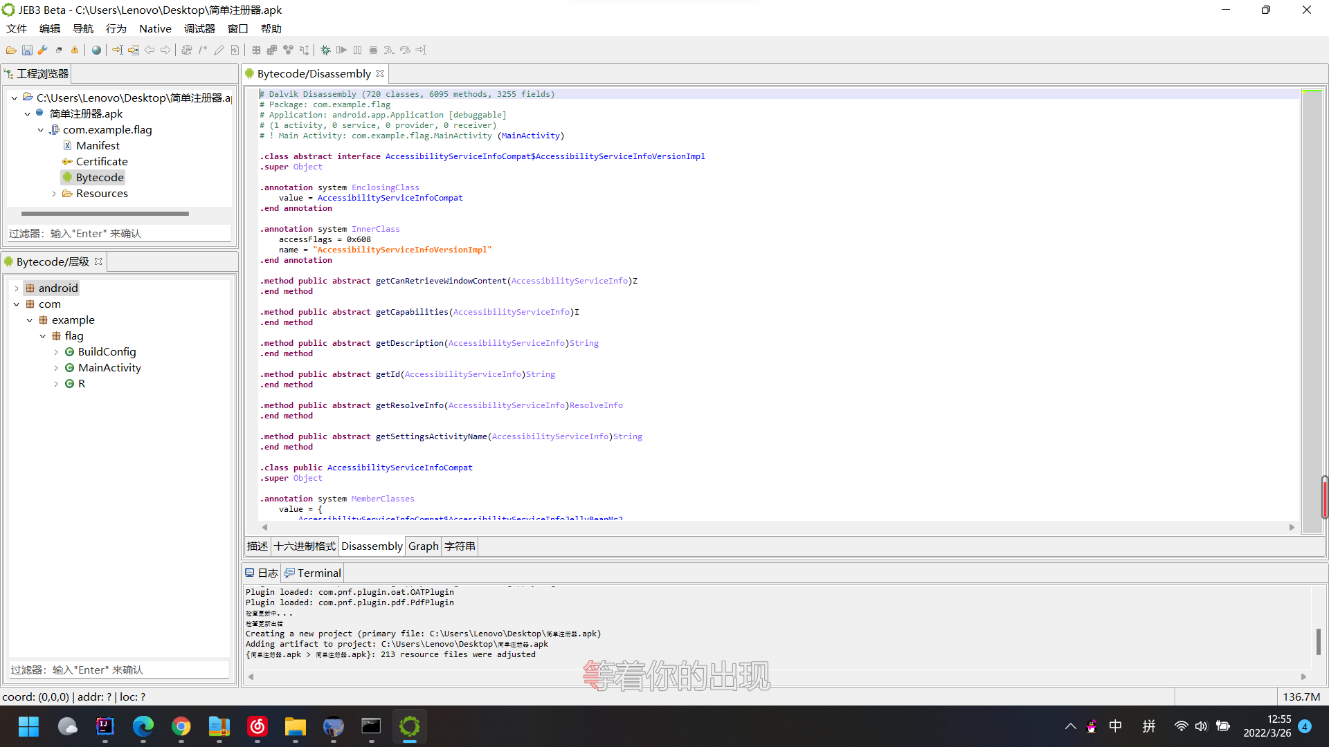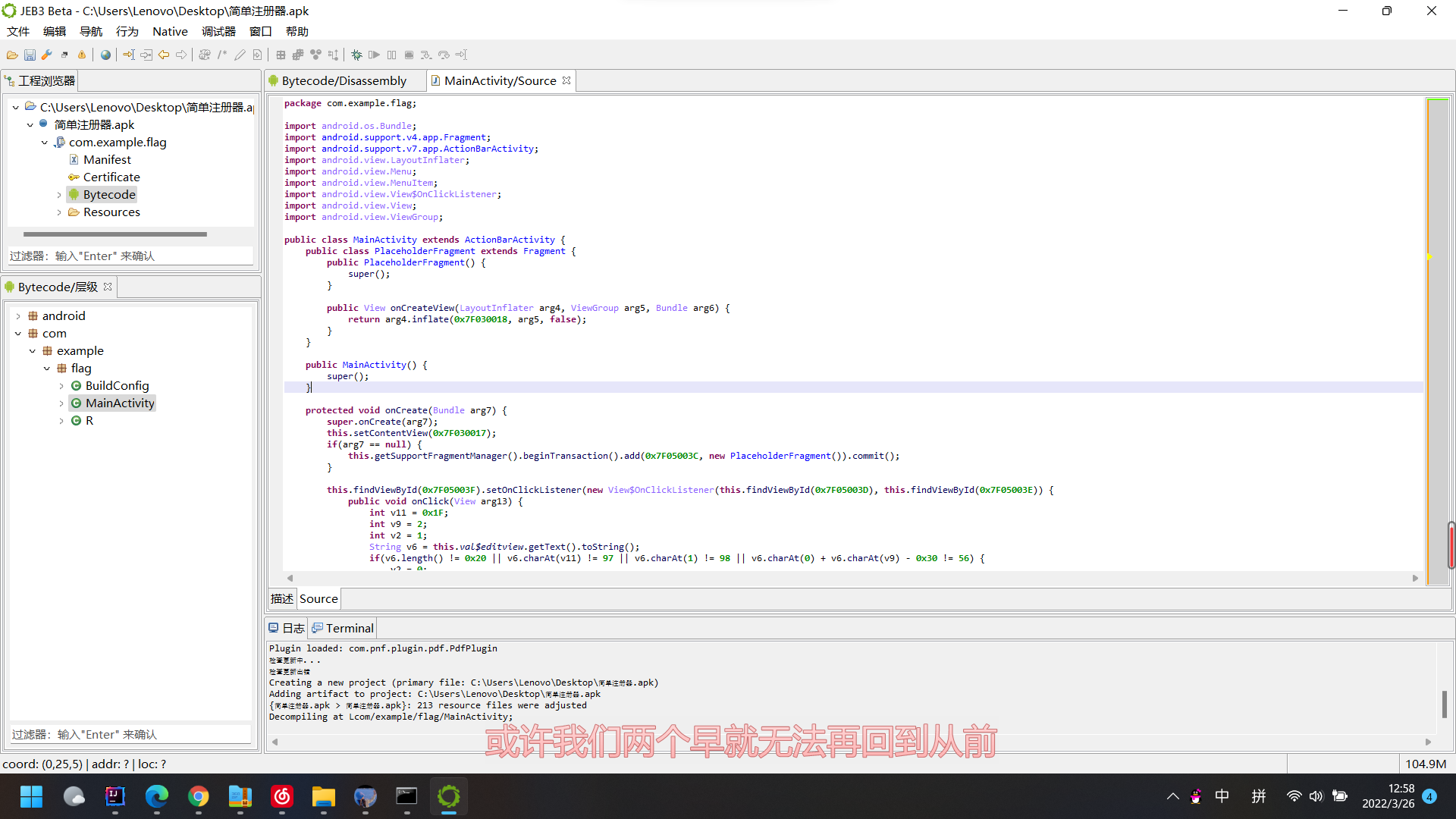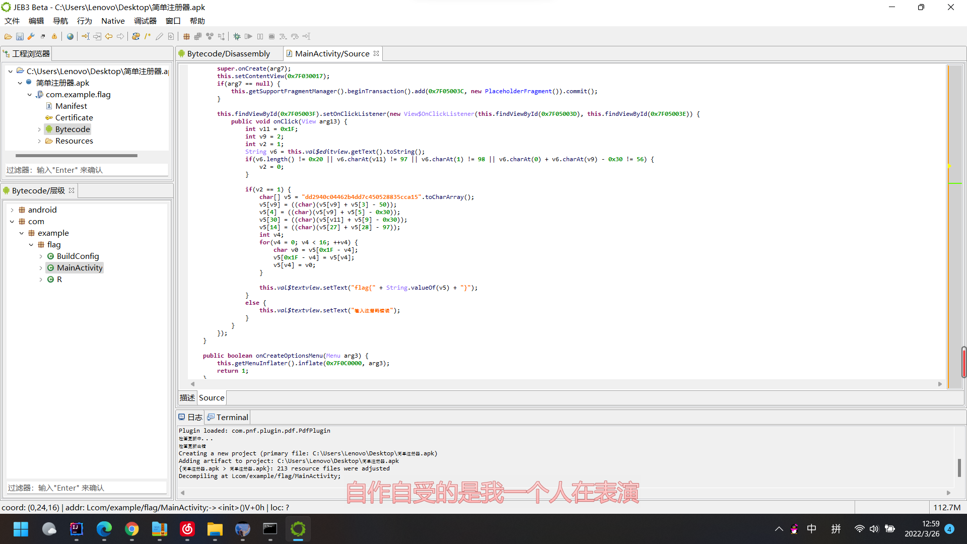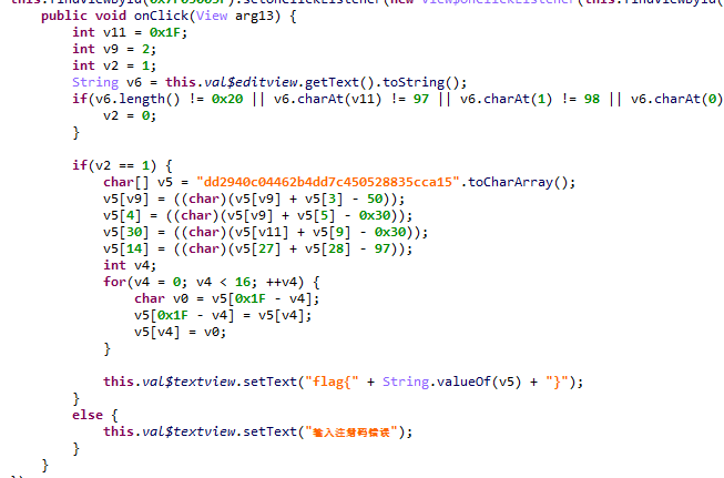 需要用到jeb,一开始还以为是打开  这个东西,然后发现打开之后出来一个很奇怪的东西,而且还带配乐  然后就觉得不对劲,然后我也不知道为什么就觉得可能是这个  然后就用这个打开试试,果然可以打开。 然后用JEB打开之后是这样的  注意左下角的这个  有个flag包。 我们也不知道哪个真正的有flag,只能自己一个个看。 然后我们选中第一个 按tab键反编译,或者是直接点右键,然后点第一个解析。 然后发现都是一些奇怪的东西,并没有什么意义。 然后选中第二个,然后按tab,然后就会看到这个页面  我们发现这个里面的java代码,好像有点可以看懂。 然后继续往下看  有一个很可疑并且一看就像是flag的地方  就是这一块 我们分析一下可以看到最后一句输出语句,会输出flag{v5}, 所以说只要解出来v5就可以知道flag是什么。 然后直接拿反编译的代码开始写代码 写出来是: