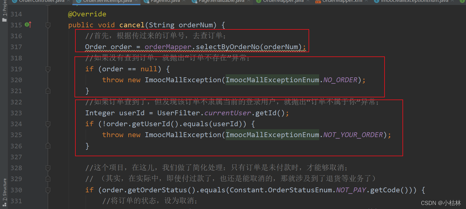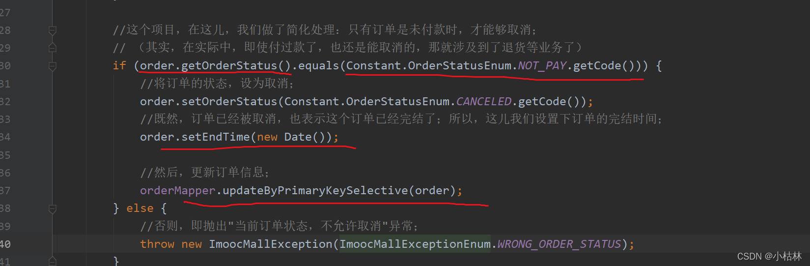 (2)然后,本项目,在这儿作了简化处理:只有当订单是未付款状态时,才能够取消;可以看到,这儿对于订单状态信息,使用了前面我们定义的枚举类;
