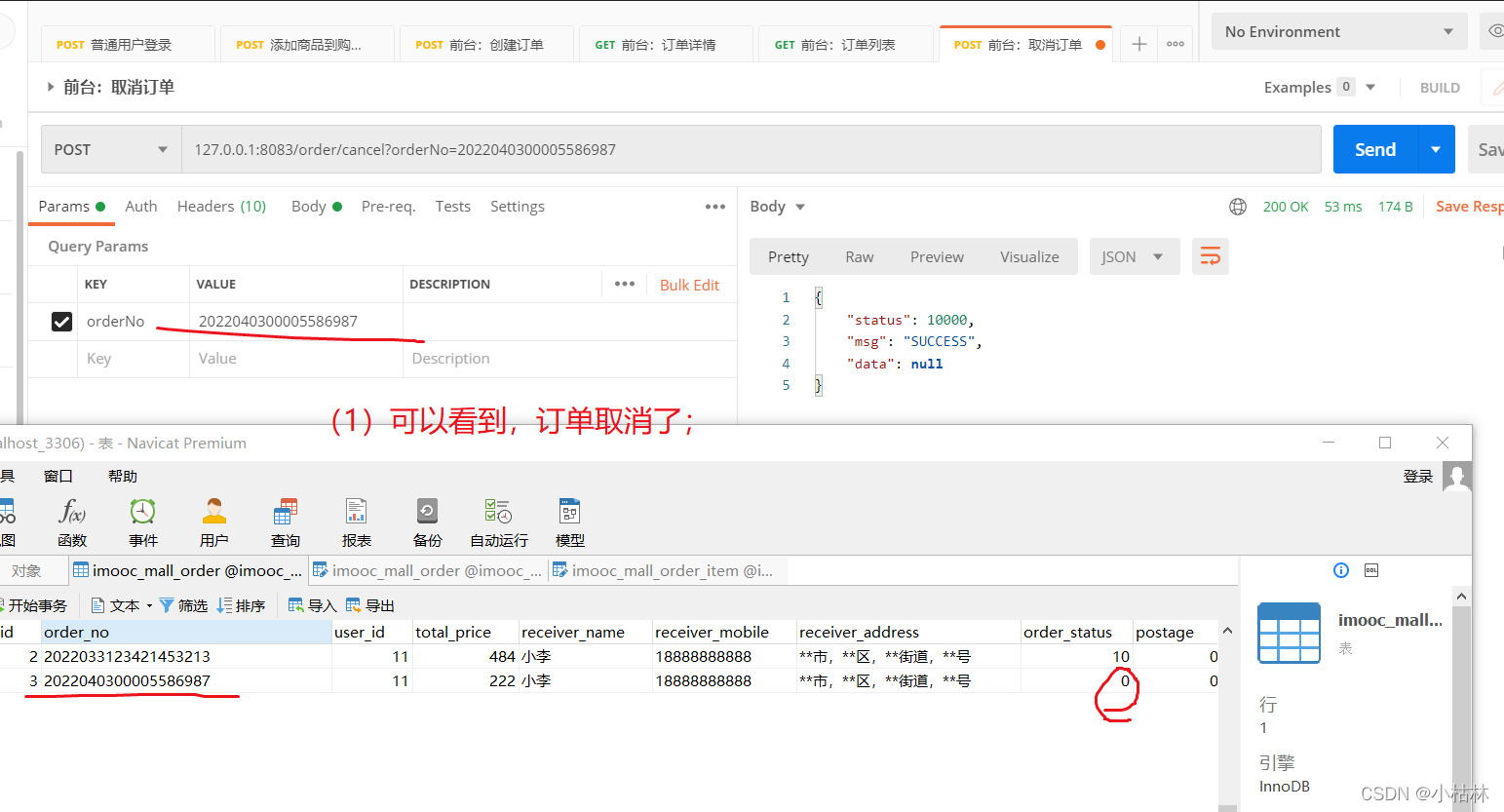 (1)本篇博客主要内容:开发【前台:取消订单】接口;