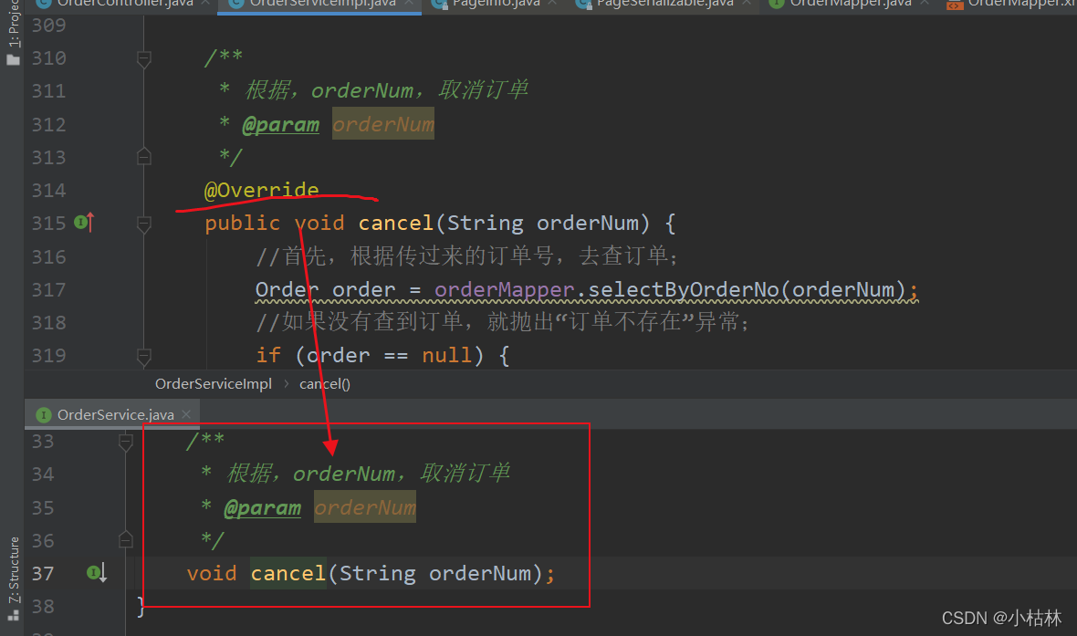 (2)我们在Service层,编写了一个根据订单号,取消订单的业务方法:cancel()方法;将在下一部分介绍;