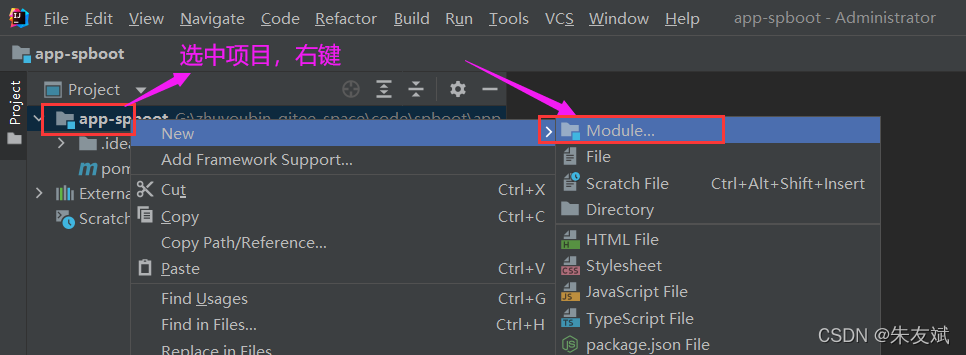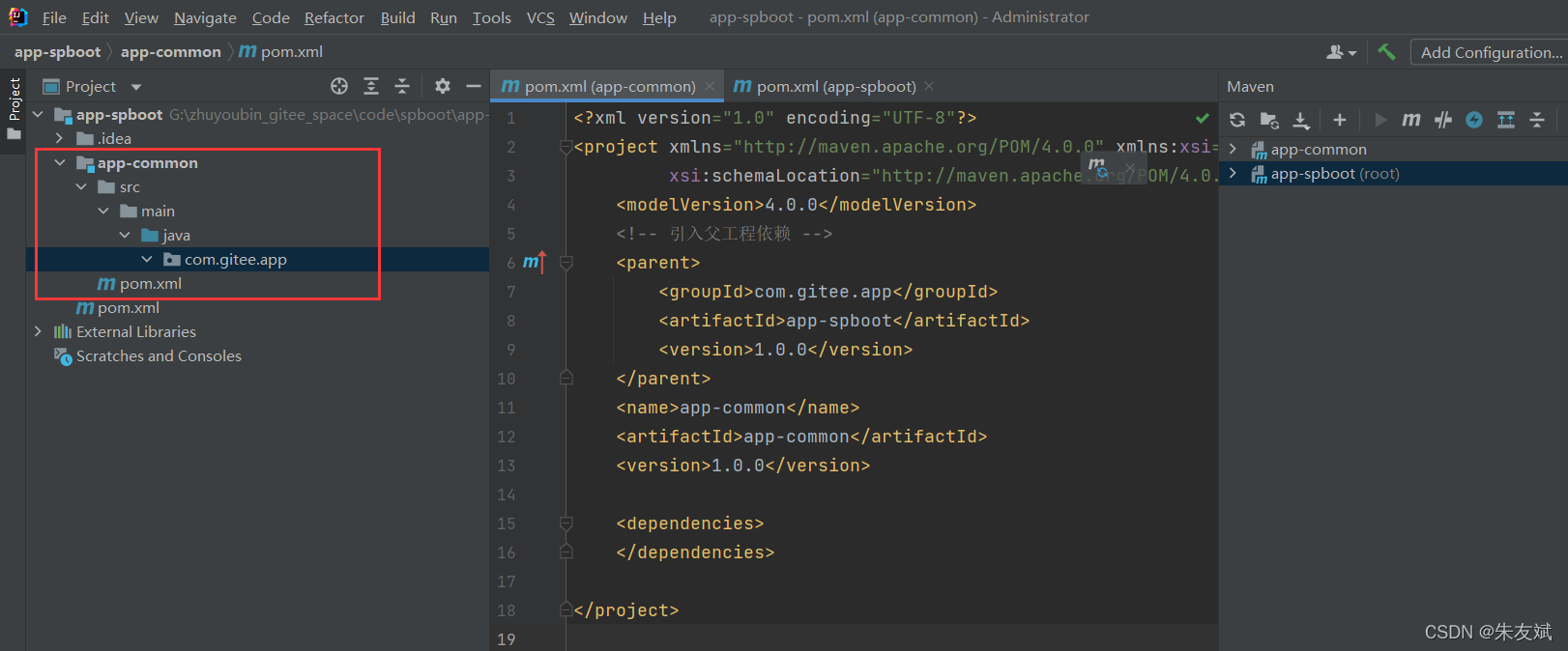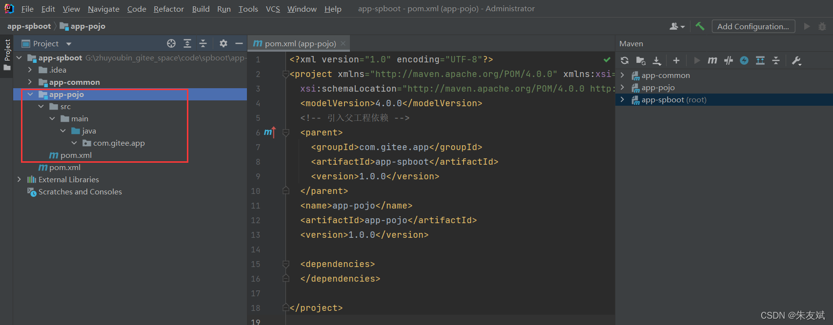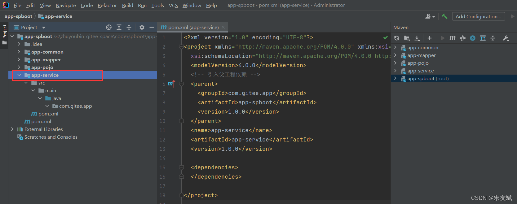 ?在子工程中,删除多余的【test】目录和【App】启动类,修改pom文件,删除多余内容,添加父工程依赖。